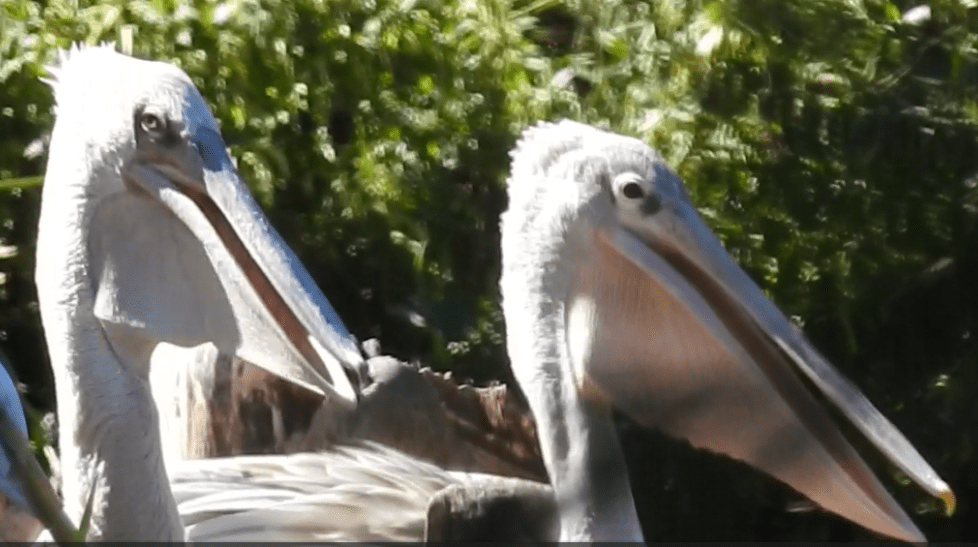 Figure 1 (a and b). Pink-backed Pelicans, at the San Diego Zoo Safari Park: (a) fluttering gular pouches—similar to dogs’ panting—to cool off; (b) smack-talking to other pelicans.