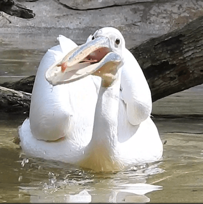 You might be wondering how pelicans can preen their feathers to keep them clean and water-resistant, using those extremely long bills. That’s where their superlong, flexible necks come in handy. In addition to keeping their feathers in good shape, pelicans do stretching exercises to keep their gular pouches flexible: stretching their necks far upward while opening their bills, or laying their bills on their breasts and extending their pouches outward.