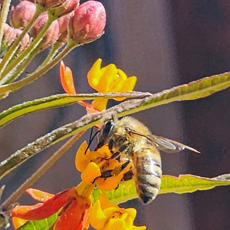 Figure 5. Hot honeybees (e.g., this Western Honeybee) regurgitate stomach contents into their mouths, then use their front feet to spread the moisture onto their bodies, to cool off. To cool their hives, honeybees use their wings to fan watery nectar, providing evaporative cooling. Photo by Sarah Haffey. All rights reserved.