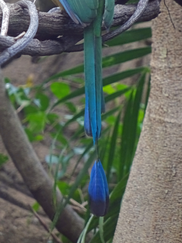 Figure 02. Observers have come up with wacky reasons why the motmot’s tail has a racket shape: “The bird plucks its own feathers,” “rivals pluck its feathers,” and so on. In truth, it’s due to genes (and evolution). Each of the motmot’s two tail feathers has weak barbs in one area. Under normal conditions, the weak barbs easily fall off the feather shaft, creating a barbless area above the “racquet.”