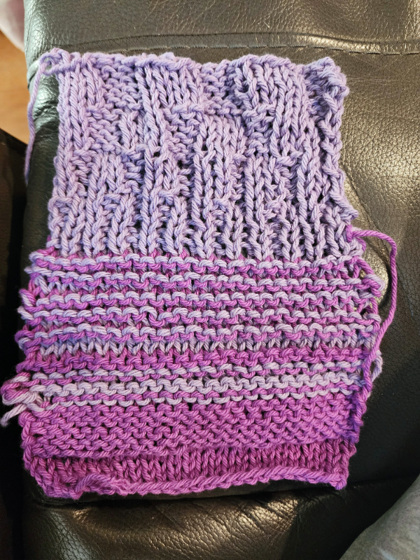Knitting sampler — casting on, knit stitches, purl stitches, stockinette, reverse stockinette, garter, ribbing, binding off.