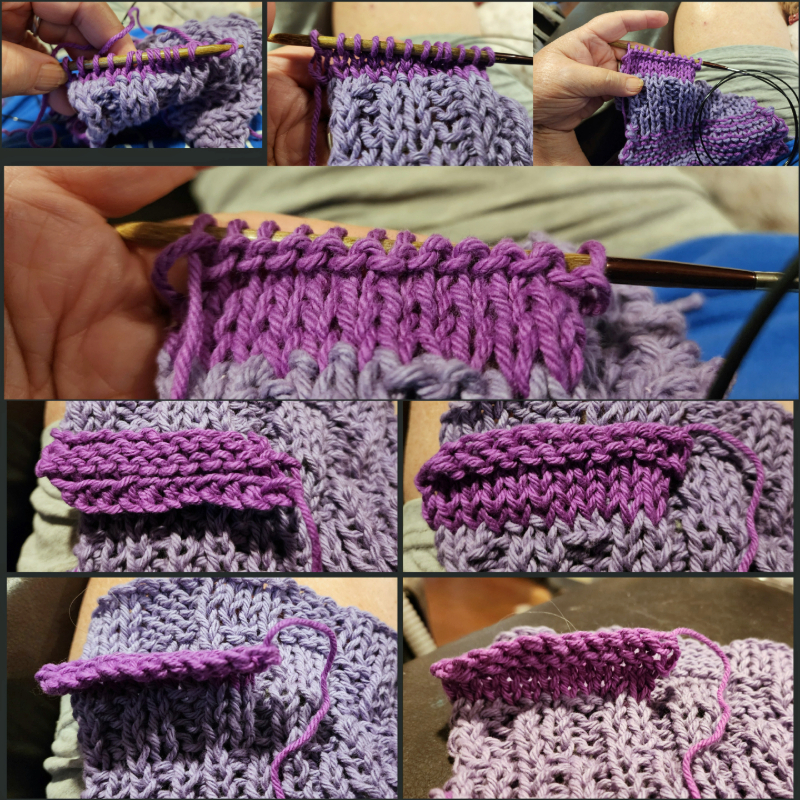 You can also make a fabric wider by adding to one or both side edges. Bear in mind, however, that if you start from a side edge, the knitting will be perpendicular to the existing fabric, going in a different direction. That can be a good thing! If you choose a complementary color or pattern, you can create an attractive “design feature” this way.