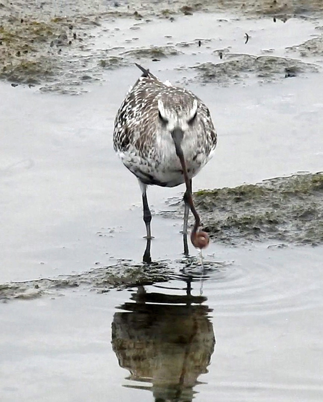 Figure 05. Whimbrels rely on vision when hunting for prey. If they feed at night, they do so more slowly, in smaller areas, and finding prey at shorter distances than they do during the daytime. The Whimbrel usually inserts the tip of its bill into soft mud, only occasionally probing more deeply. (The Long-billed Curlew, seen toward the end of the clip, probes more deeply and uses touch, as well as vision, to find prey.)