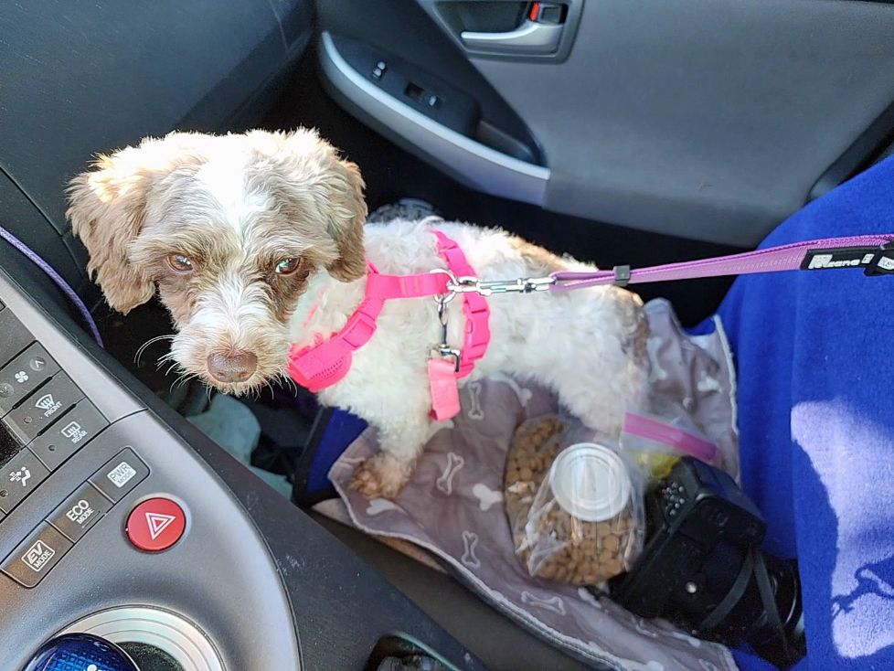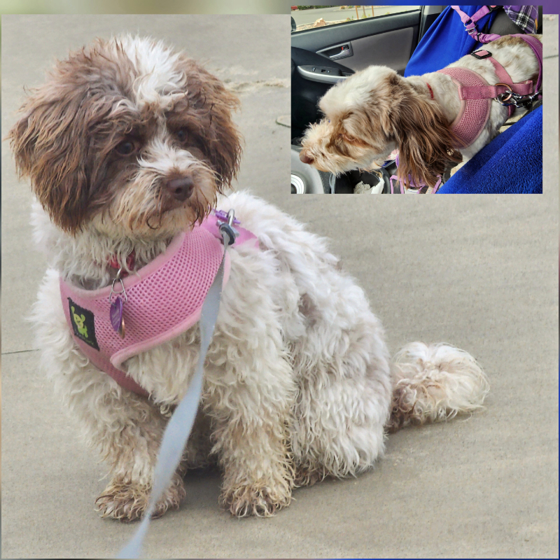Sweetie, a few pounds heavier, in her current harness