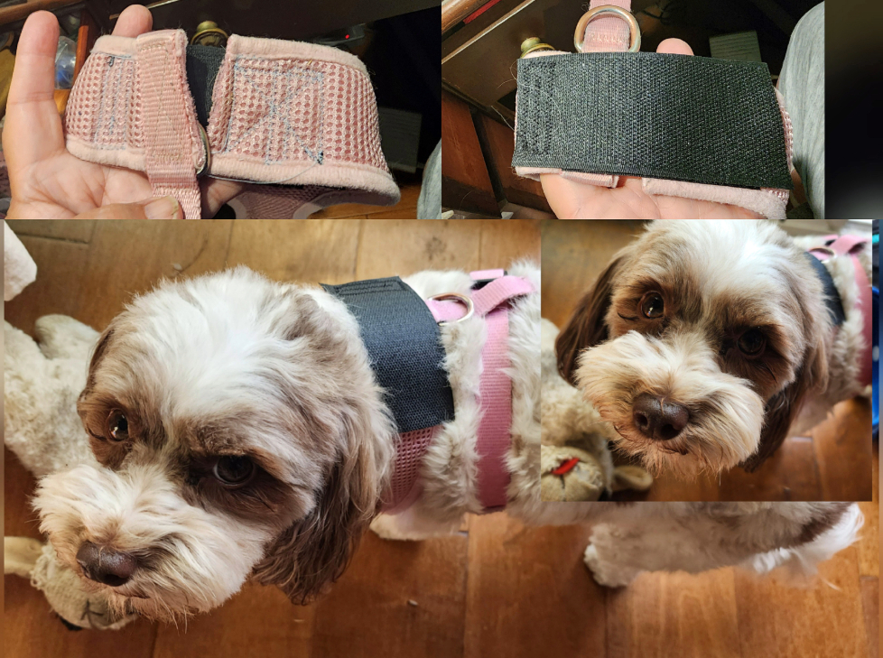 Then my ingenious neighbor suggested that I find a way to make an opening in the neck. DUH! If your dog is similarly reluctant about having a harness pulled over its head, add an opening!