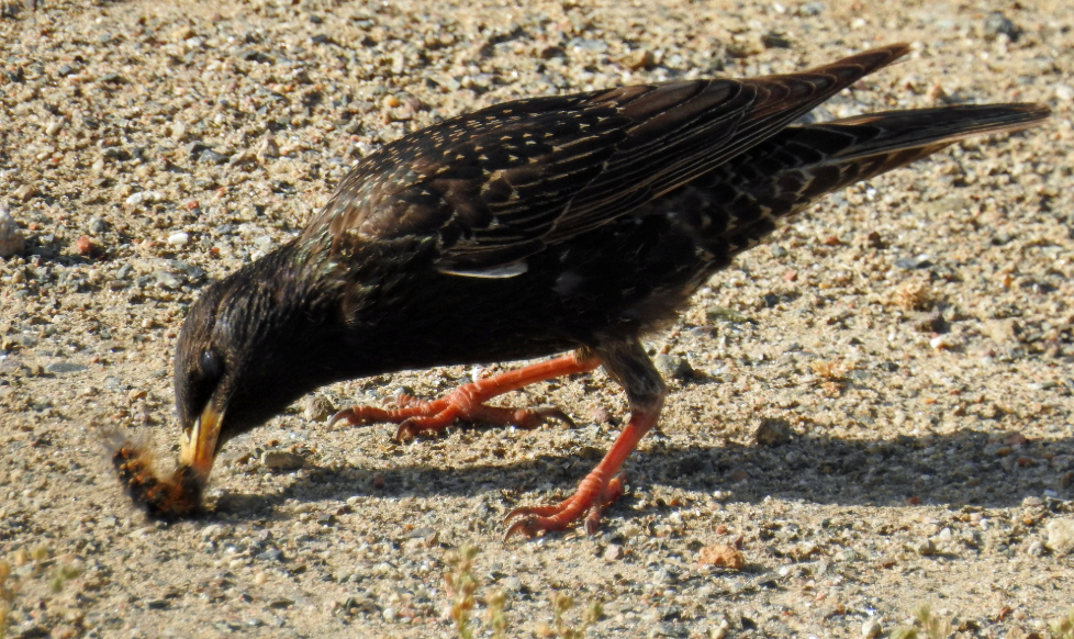 Figure 11. This European Starling is eating a leaf-eating caterpillar, but this caterpillar will never become a pollinating butterfly. Is the starling helping or hurting plants?