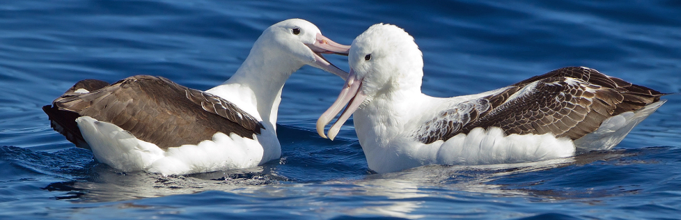 Figure 03. Tubenoses, such as these Southern Royal Albatrosses, have tubelike nostrils that keenly detect the scent of their favorite prey in the vast ocean. Source, JJ Harrison (https://www.jjharrison.com.au/), Southern Royal Albatrosses (Diomedea epomophora) ‘beaking’; East of the Tasman Peninsula, Tasmania, Australia; 2 September 2012, 12:16:09. This file is licensed under the Creative Commons Attribution-Share Alike 3.0 Unported license. You are free to copy, distribute, and transmit the work if you give appropriate credit. See https://en.wikipedia.org/wiki/Southern_royal_albatross for more information about this species of tubenose. See https://en.wikipedia.org/wiki/Procellariiformes for more on all species of tubenoses.