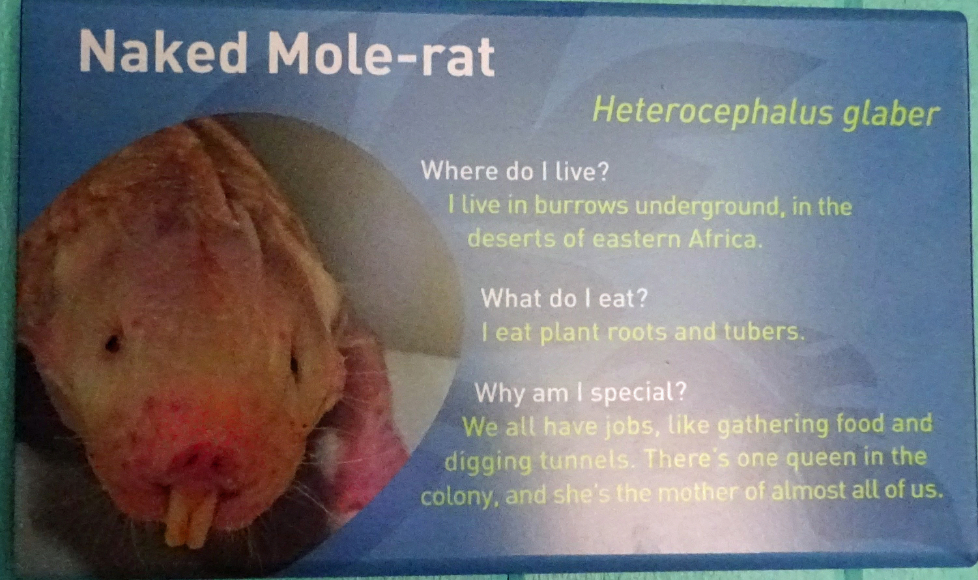 Figure 07. The lower incisors of Naked Mole-rats can splay apart and close together, to grasp things. More remarkably, these rats can live up to 33 years — extremely long for a rodent!!! They live in elaborate underground tunnels, where carbon dioxide can accumulate; luckily, they can survive up to 18 minutes with no oxygen. Probably more important than their teeth or their underground home is their lifestyle: Like ants or bees, Naked Mole-rats live in cooperative colonies, and they like cuddling together. (If you live in San Diego, you can visit Naked Mole-rats in the Wildlife Explorers Basecamp — aka the Children’s Zoo.)