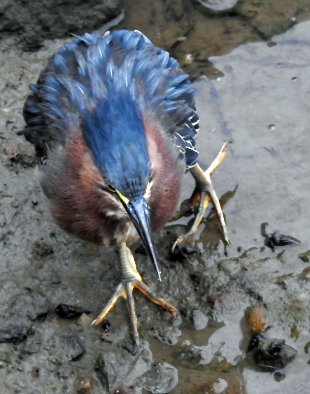 Figure 05. Like other herons, this Green Heron has long anisodactyl toes, with three pointing forward, one pointing backward, making it easier to walk on mud, vegetation, and other smooshy ground.