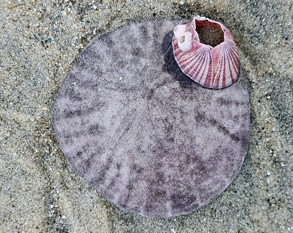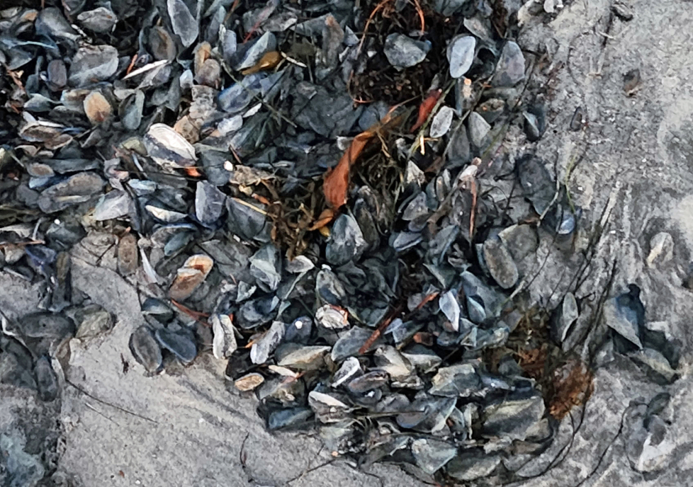 Figure 03(a–d). Even at the sandy beach, plants — such as kelp (a) — and animals — such as sand dollars (b, flat sea urchins), barnacles (b, crustaceans, related to crabs), Velella velella (c, a cnidarian related to Portuguese man o’ wars), and mussels (d) — carry microbes within them and around them, despite intermittent salt-water baths at high tides.