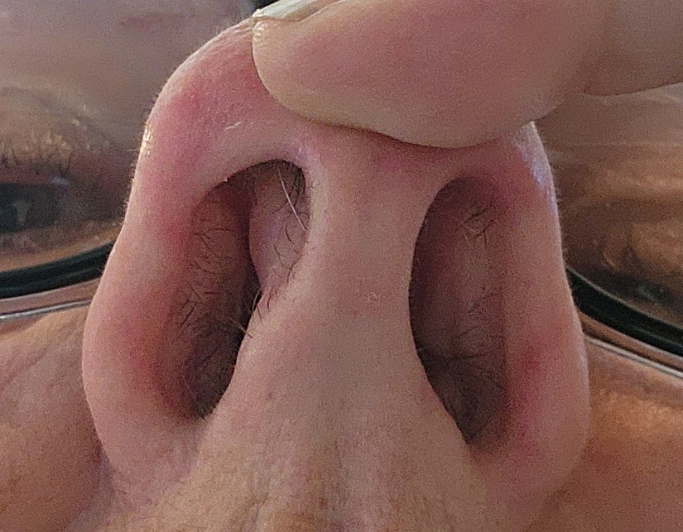 Figure 08 (a,b). In these highly flattering photos, you can see where I store some of my favorite microbes: my nostrils and the back of my hand. Each location hosts distinctive microbes.