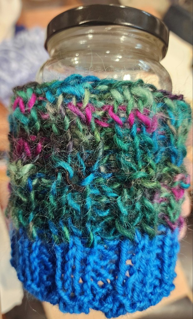 - A 2 × 2 ribbing ensures that the cozy will be stretchy enough to snugly hold the jar while not stretching out.
