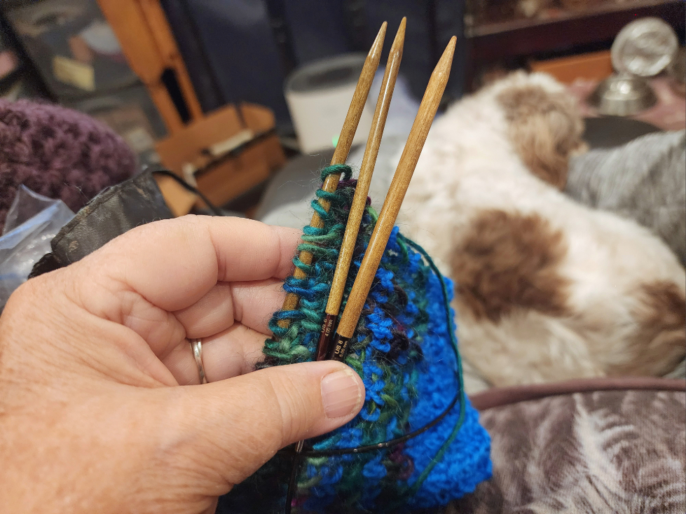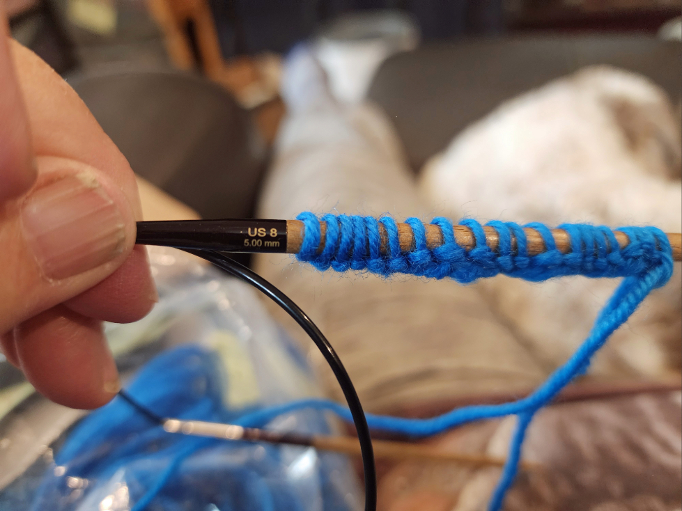 Figure 10. Using a larger knitting needle, cast 20 stitches onto your needle. (I use long-tail cast-on, but you use whatever method works for you. For this project, it would even work just to wrap 20 stitches around the needle and work from there.)