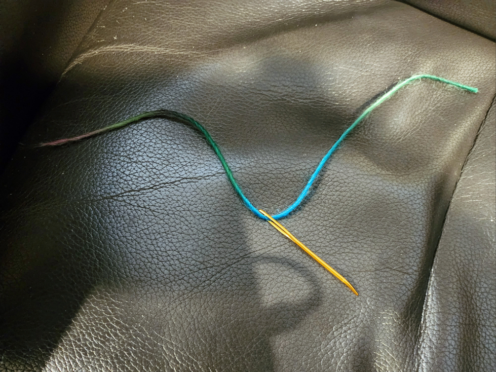 - Thread your yarn needle with your main color of yarn, about three times the length of your anticipated seam. Go through the first stitch of one side, leaving about a 3″ tail at the end. Then go through the first stitch of the other side. Turn the needle and go through the second stitch of this side, and then go through the second stitch of the first side. Continue in this manner, turning the needle back and forth as you proceed stitch by stitch. It’s not a disaster if you simply stitch round and round, from right to left (or left to right), but it creates a bulkier seam. If you do this, call it a “design feature.”