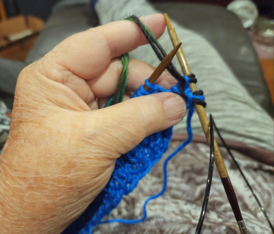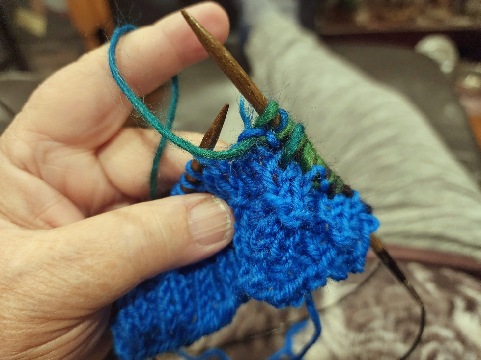 Figure 11a–b. Whenever I felt like doing so, I switched from the main yarn (blue?) to another yarn (variegated?) with the same or very similar thickness/weight. I felt like switching at Row 13. You may prefer not to switch yarns, or to switch yarns often.