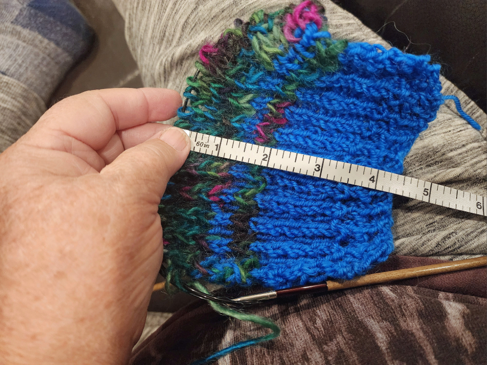 Figure 12. Before you bind off, test the length of your cozy, to be sure it’s long enough.