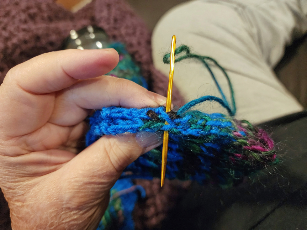 For any extraneous tails of yarn, use your yarn needle to weave them back into the fabric for at least 15 or so stitches, then tug slightly on the tail. With the tail pulled slightly taut, snip the tail a short distance (½ “?) from the fabric, then stretch out the fabric, and the tail will disappear into the fabric.
