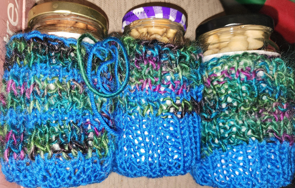 Here are some easy-to-make, inexpensive gifts: knitted cozies to wrap jars filled with treats.