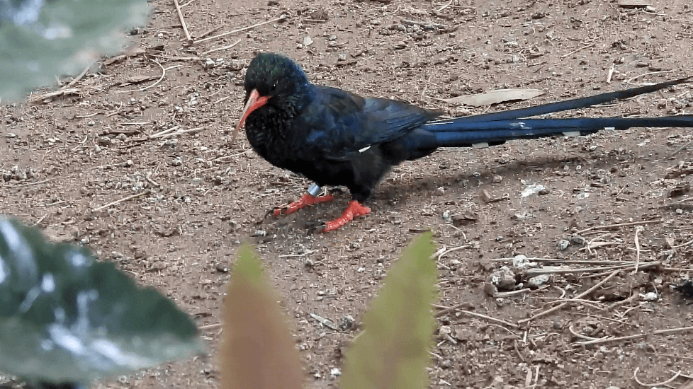They’re well-built for foraging in the trees. Short legs with long toes and claws enable them to scamper up and down trees easily. Stiff tails (like woodpeckers) give them support and leverage when rooting out arthropods. Long slender bills can probe deeply into crevices or holes in tree bark, to extract their prey. When they do descend to the ground, they hop (not walk) among the leaf litter, searching for prey. (Phoeniculus species occasionally go to ground; Rhinopomastus species rarely do.)