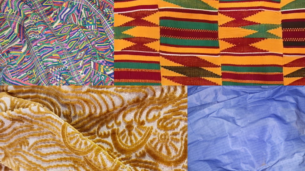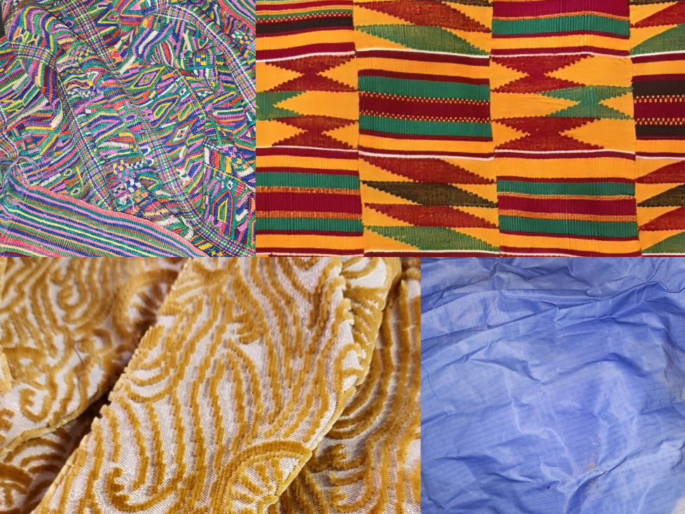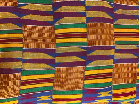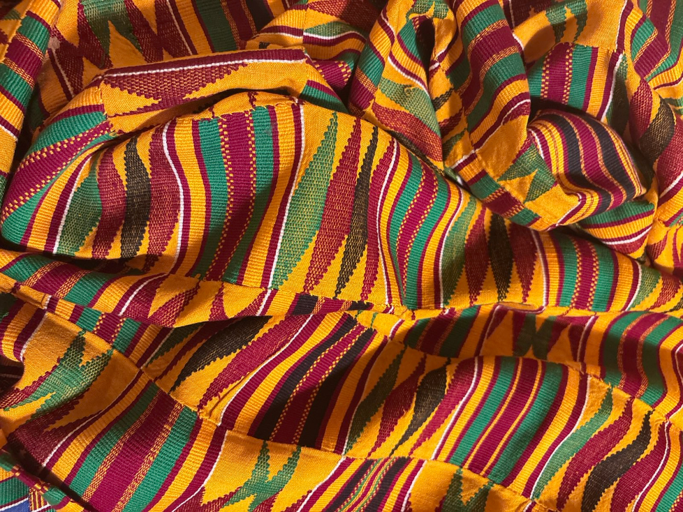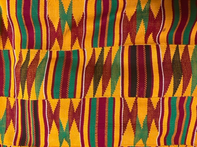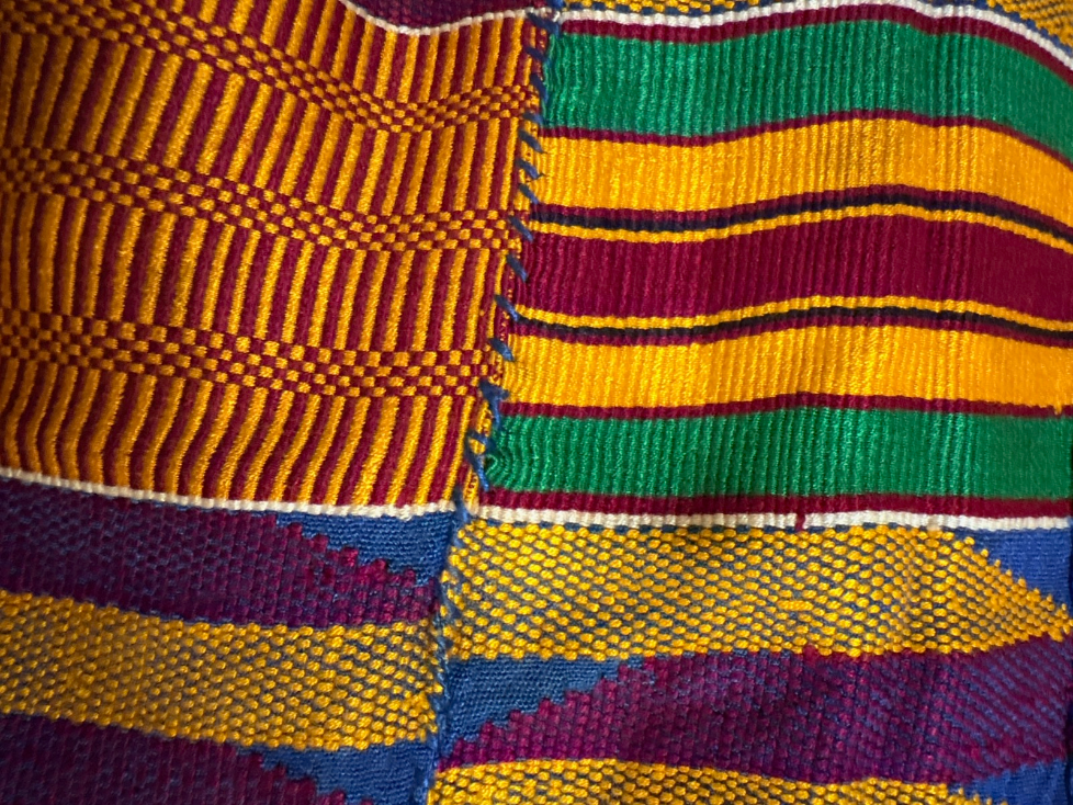 Figure 05-01. Traditionally, in West Africa, fabric was woven into strips, then these strips were sewn together to make larger textiles. My lifelong friend Kikanza Nuri generously shared with us her photos of Kente cloth she has on hand. (Contemporary kente cloth strips can be machine sewed together.)