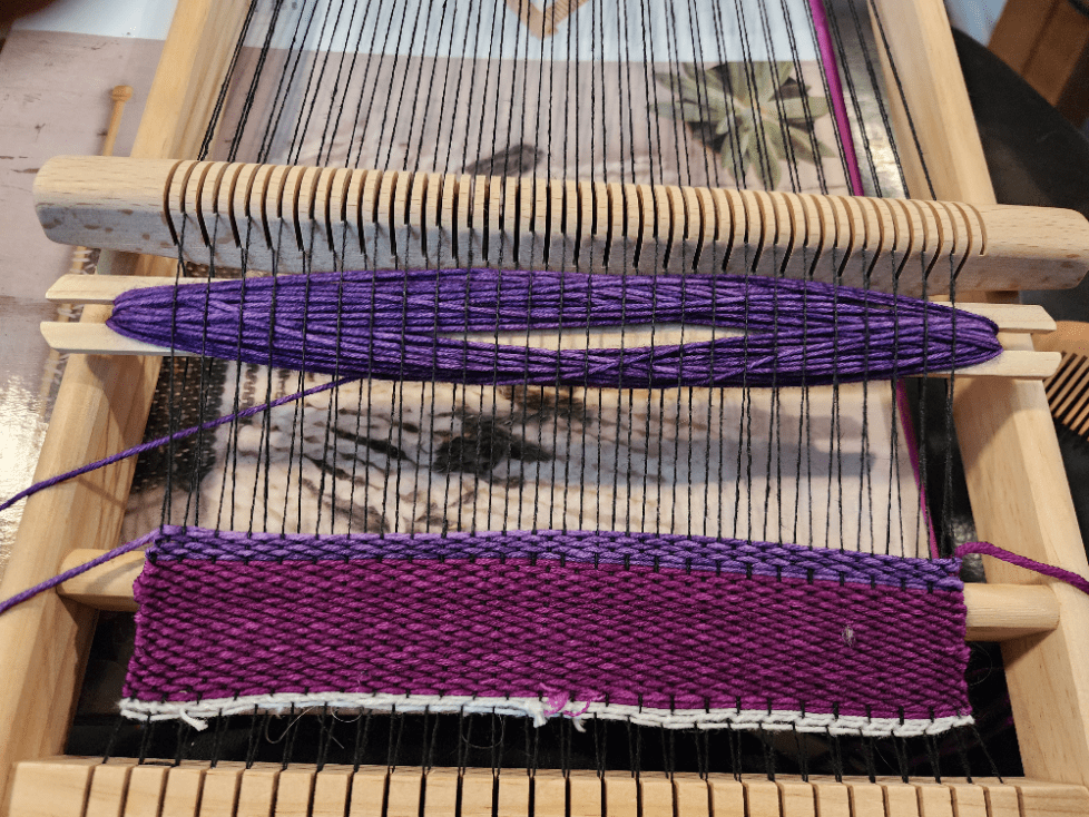 Figure 05-03. In the late 1600s, “fustian” fabric used strong linen threads for the warp and softer threads for the weft. This simple hand loom is using the same combination, but on a much smaller scale.
