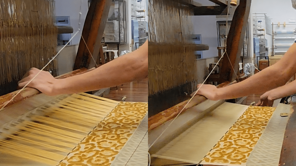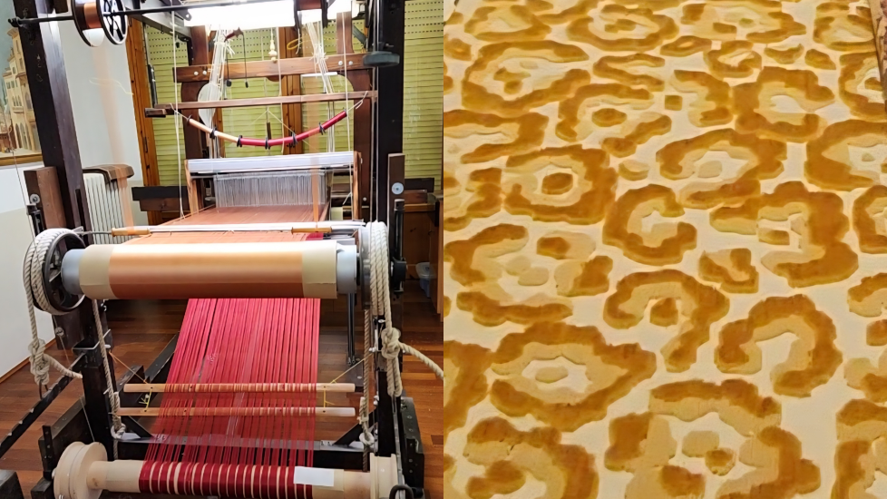 Figure 06-01. In November, 2022, I was able to visit the Fondazione Arte della Seta Lisio in Florence, Italy. (In my blog on “Cloth,” I shared photos of the Jacquard loom there, https://bird-brain.org/2026/04/15/cloth/#Jacquard-loom .) One of the specialties of the Fondazione is the production of silk velvet brocade. (Needless to say, I did not attempt to weave on the looms producing this luxurious fabric.) Top left is a silk-brocade loom, top right is a closeup of silk-velvet brocade. At bottom is the process of weaving silk-velvet brocade; with half the threads raised (right), the weaver creates the basic fabric, but with only some threads raised (left), the weaver creates the velvet brocade pattern.