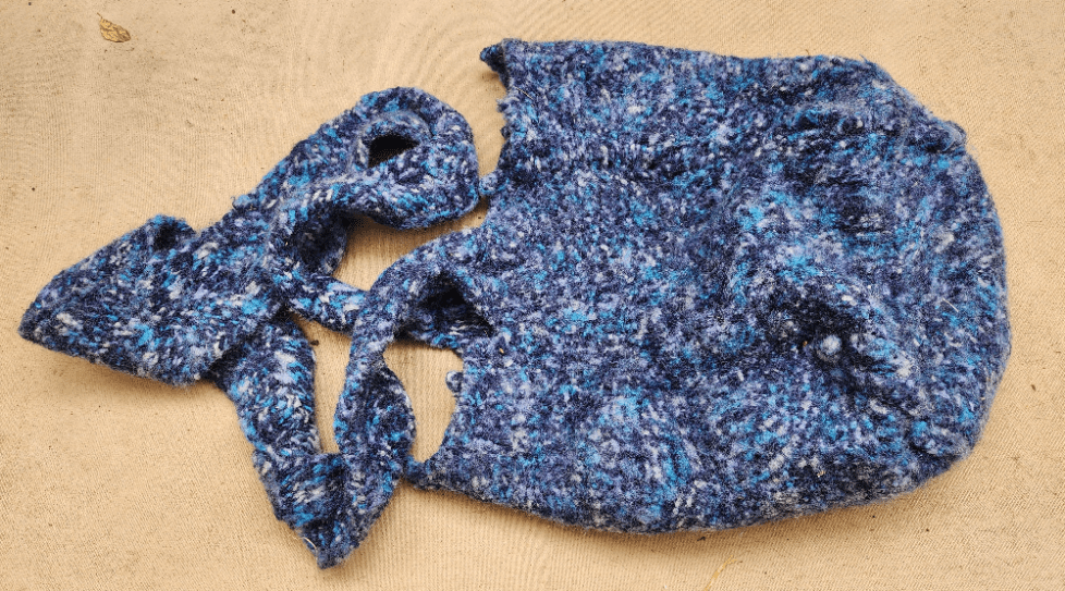 Figure 06-02. This bag was knitted with 100% wool yarn, then it was felted in hot water, using strong agitation. The friction of the agitation, in the hot wet environment, felted the fabric, tightening and shrinking it, making it denser and stronger. It’s nearly impossible to detect any individual knitted stitches. On a much grander scale, this felting process was used by the Mongols to create enormous felt tents and other items.