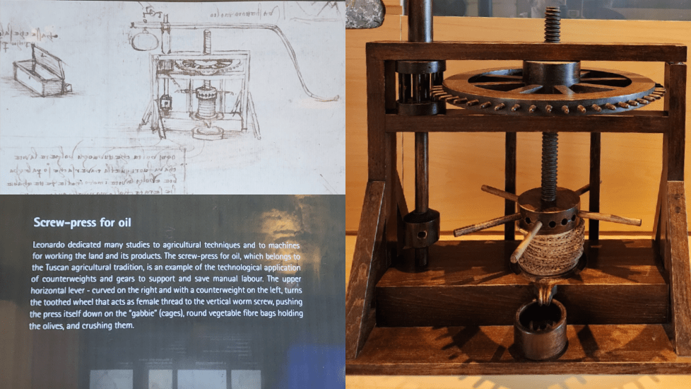 Figure 06-03. During the Italian Renaissance, sumptuary laws were restricting what people were allowed to wear — unless they could afford fees or fines to avoid those restrictions. Of course, most ordinary workers had more urgent concerns than the avoidance of sumptuary laws. Even Leonardo da Vinci may have been more preoccupied with his inventions (such as this screw press for extracting oil) or his artistry than with his attire.