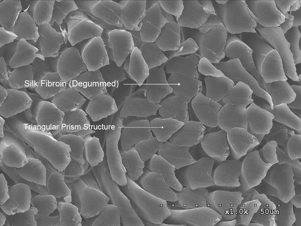 Figure 07-04. Micrograph of fibroin silk filaments — “Cross-section of degummed silk fibroin filaments. The characteristic triangular prism structure refracts light, creating the fiber’s optical luster.” (See also https://en.wikipedia.org/wiki/Fibroin for more information on fibroin.)